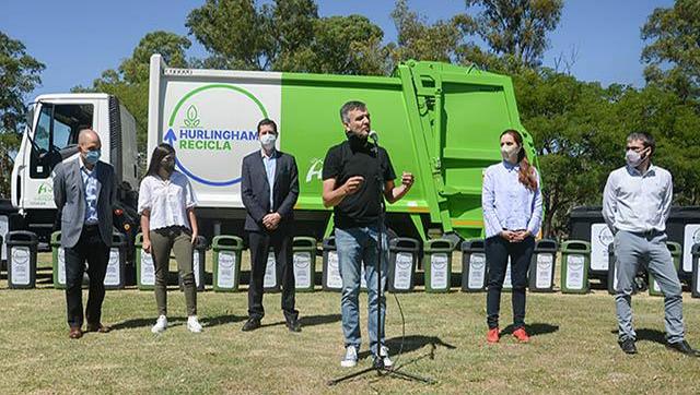 El intendente Juan Zabaleta y el ministro del Interior de la Nación, Eduardo “Wado” de Pedro, presentaron un camión recolector y nuevo equipamiento para poner en marcha el programa “Hurlingham recicla”, una política ambiental que tiene como objetivo reducir la basura, recuperar residuos reutilizables y generar empleo. A partir del programa “Municipios de Pie” del gobierno nacional, se incorporó una nueva unidad y 110 contenedores que servirán para llevar adelante esta iniciativa en el distrito. En la jornada participaron la diputada nacional Florencia Lampreabe, el subdirector Ejecutivo del PAMI, Martín Rodríguez y el secretario de Municipios de la Nación, Avelino Zurro.