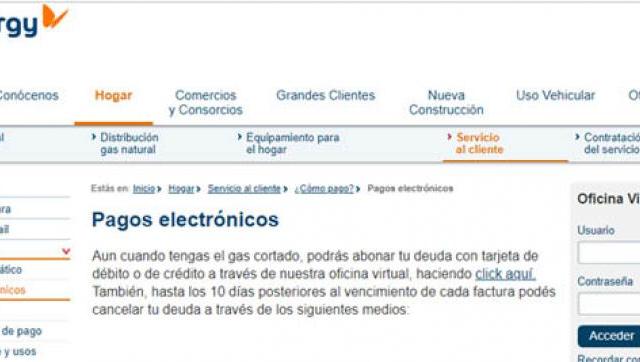 Ingresando a la Oficina Virtual los usuarios podrán abonar sus facturas de consumo con tarjeta de crédito o débito, en cualquier momento y lugar, de forma ágil y segura. A través del Botón de Pago, los usuarios no sólo podrán abonar las facturas por vencer sino que, también, podrán realizar el pago de facturas vencidas, aún si el servicio de gas se encontrase suspendido o con orden de corte ya programada.