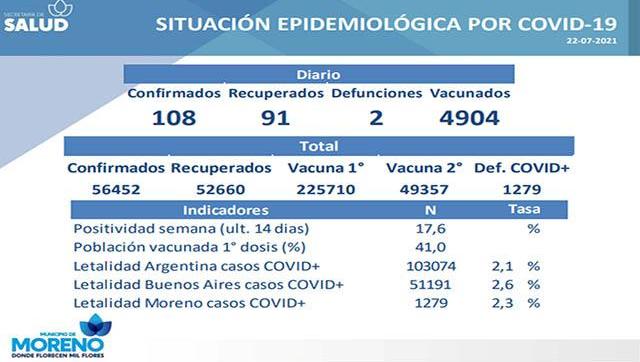 El municipio de Moreno dio a conocer que ya se aplicaron 275067 vacunas contra el COVID-19, de las cuales 225710 corresponden a la primera dosis y 49357 a la segunda.