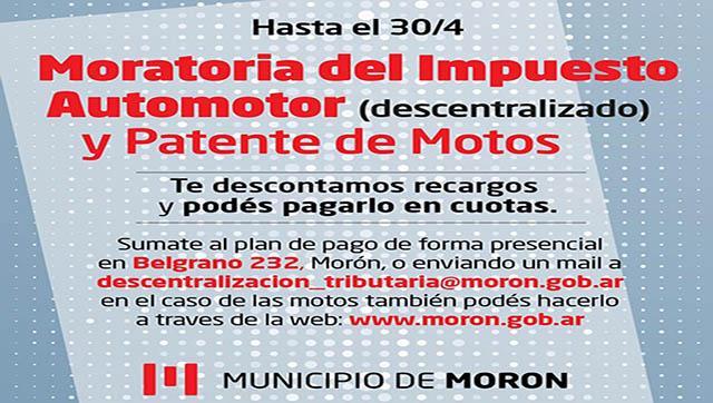 El Municipio de Morón, a través de la Moratoria del Impuesto Automotor Descentralizado y Patente de Motos, realiza descuentos en recargos y da la posibilidad de financiar en cuotas a quienes adeuden dicho impuesto.